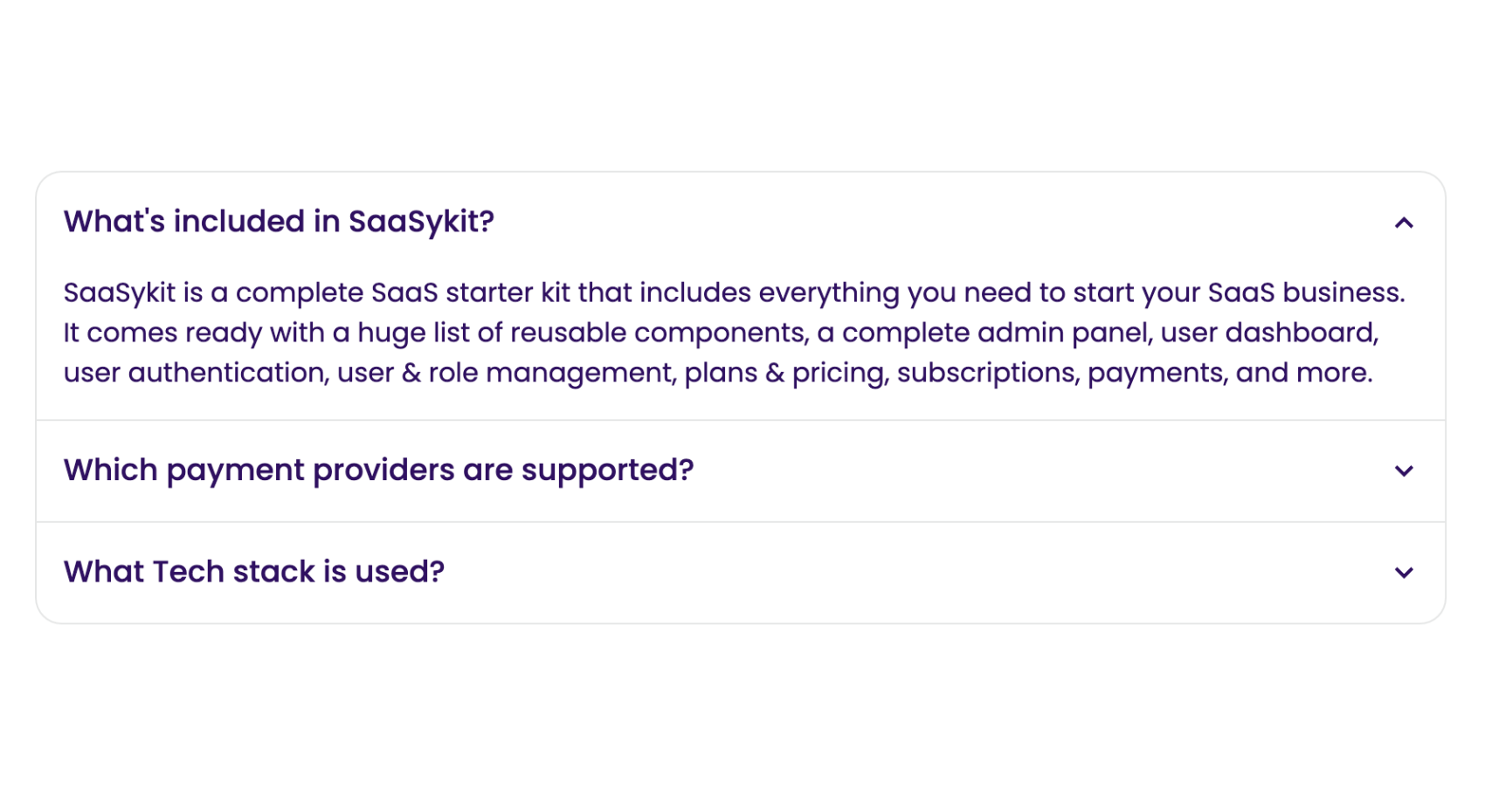 SaaSykit is a complete SaaS starter kit that includes everything you need to start your SaaS business. It comes ready with a huge list of reusable components, a complete admin panel, user dashboard, user authentication, user & role management, plans & pricing, subscriptions, payments, emails, and more.