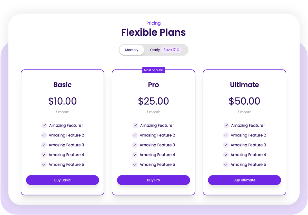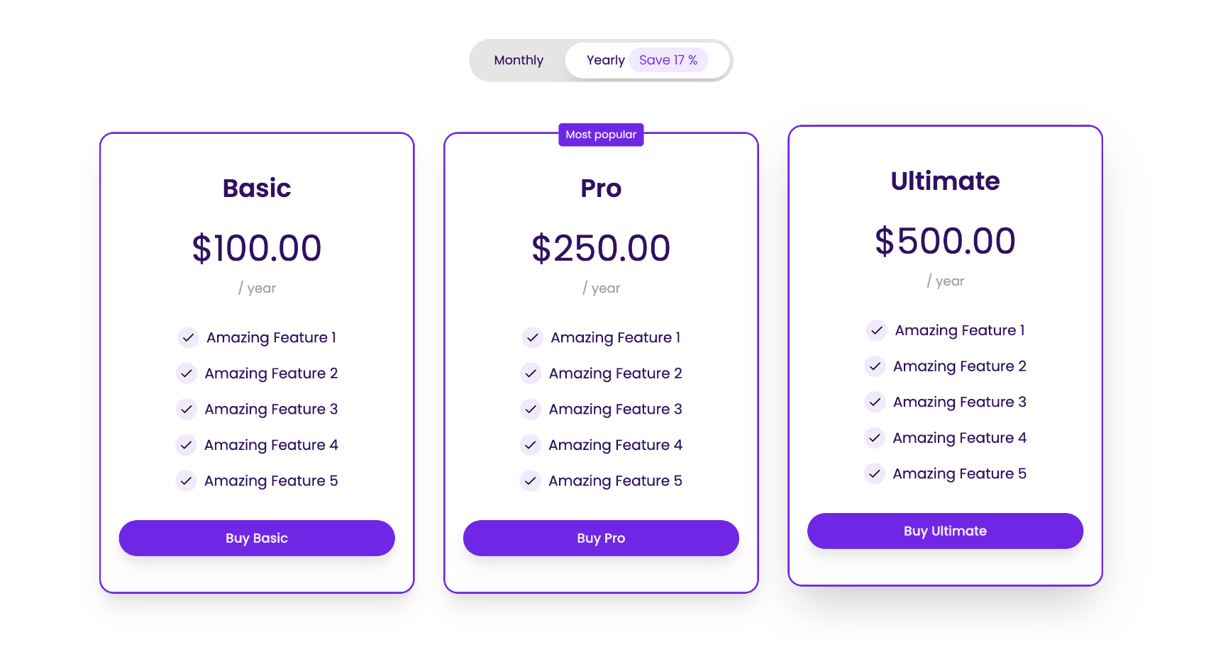 This component is magical in that it will read the plans you defined in your admin panel, group them, calculate potential discount amount if user chooses a longer plan, and display all that in a beautiful way for your users.